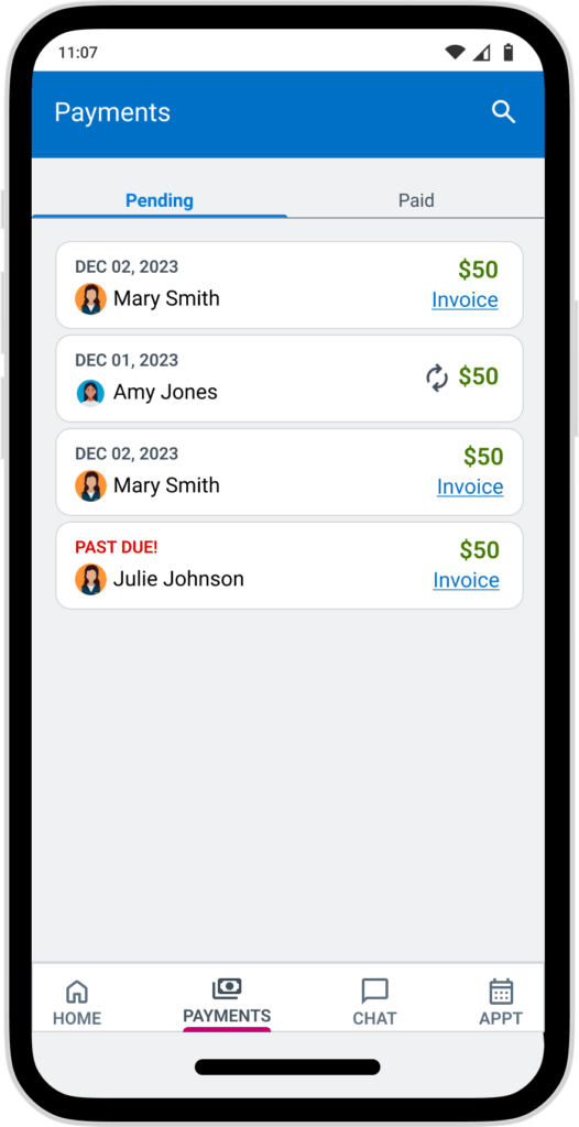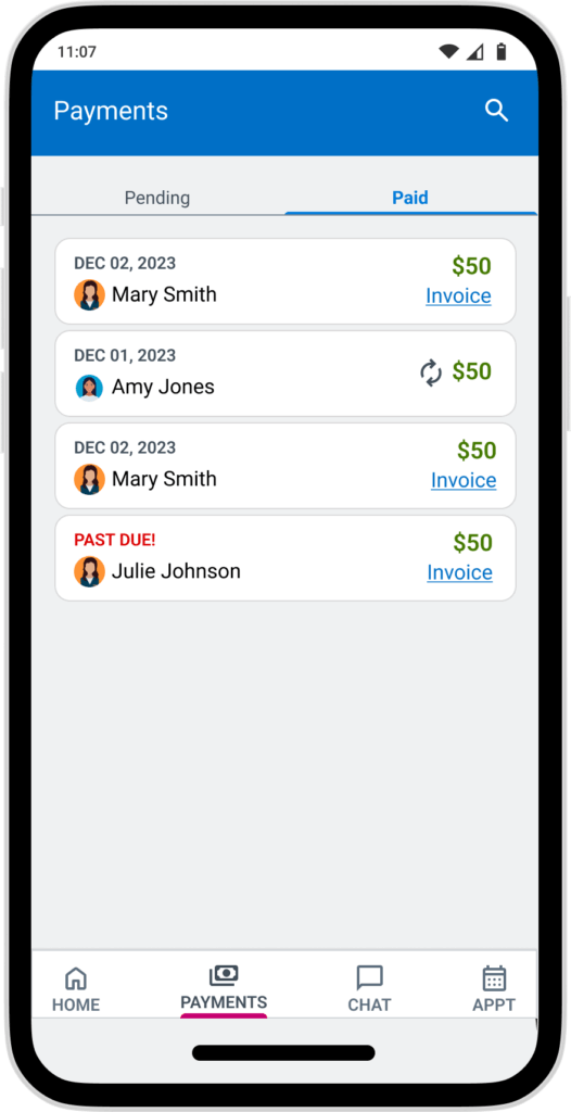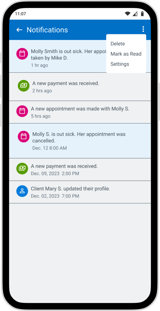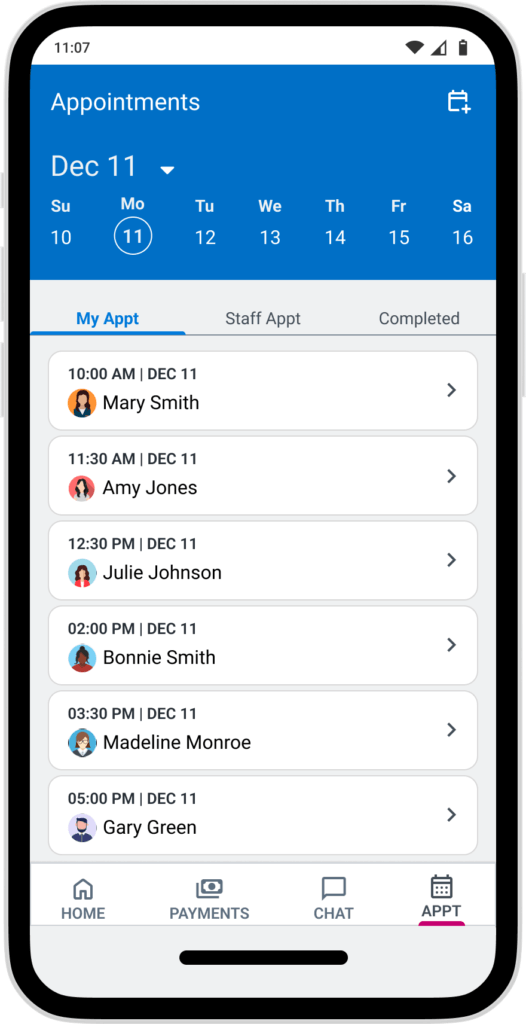 Give the adminstrator a list of their appointments for the day so they can see what they need as soon as they open the app. The day at a glance also shows the total number of appointments and payments for the day so they can keep track of progress.