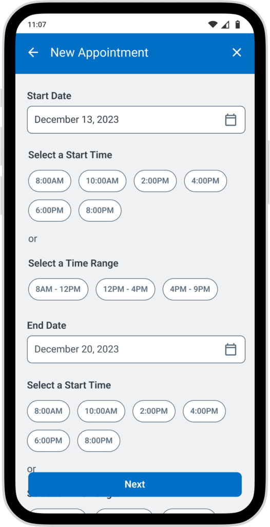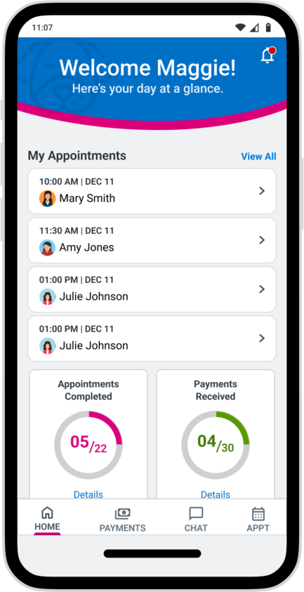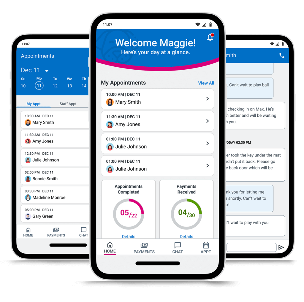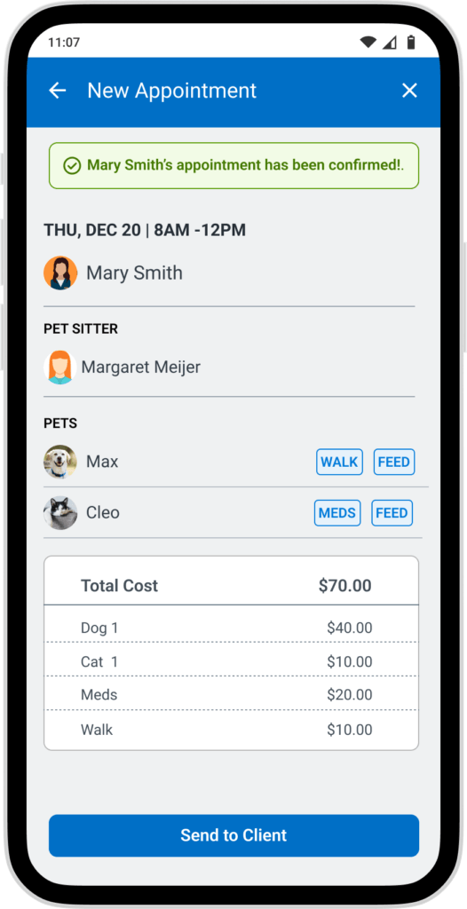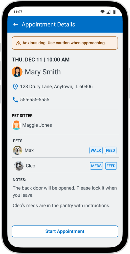 Give the pet sitter a way to see all of their appointments, their staff’s appointments, details of that appointment and a way to create a new appointment while out visiting their clients.